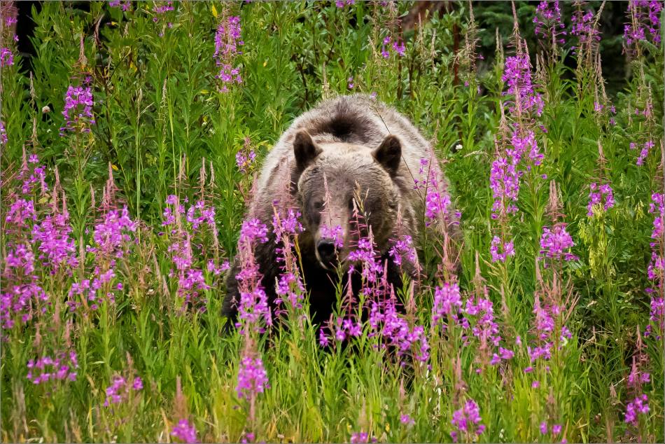 A grizzly bear in the fireweed