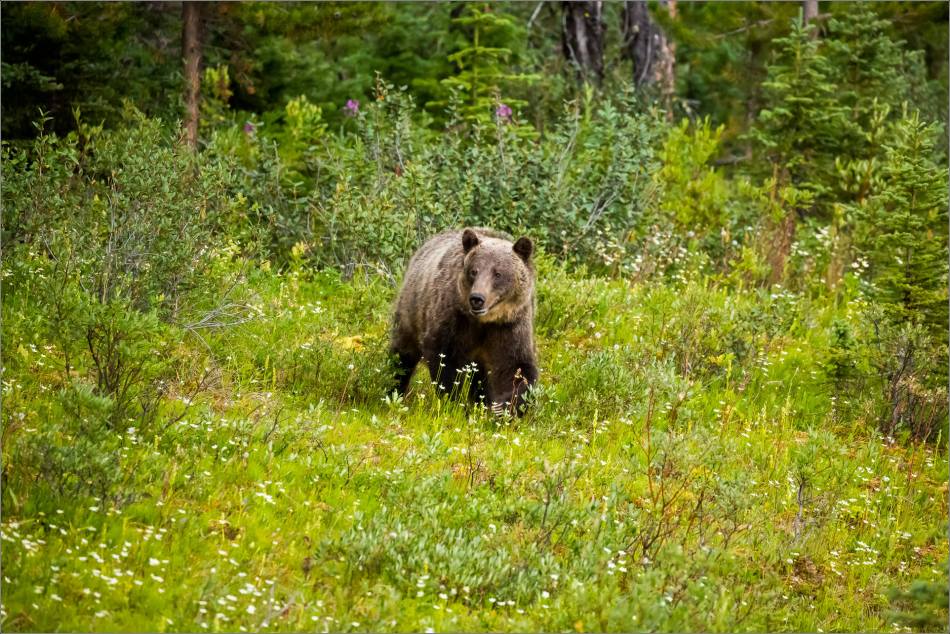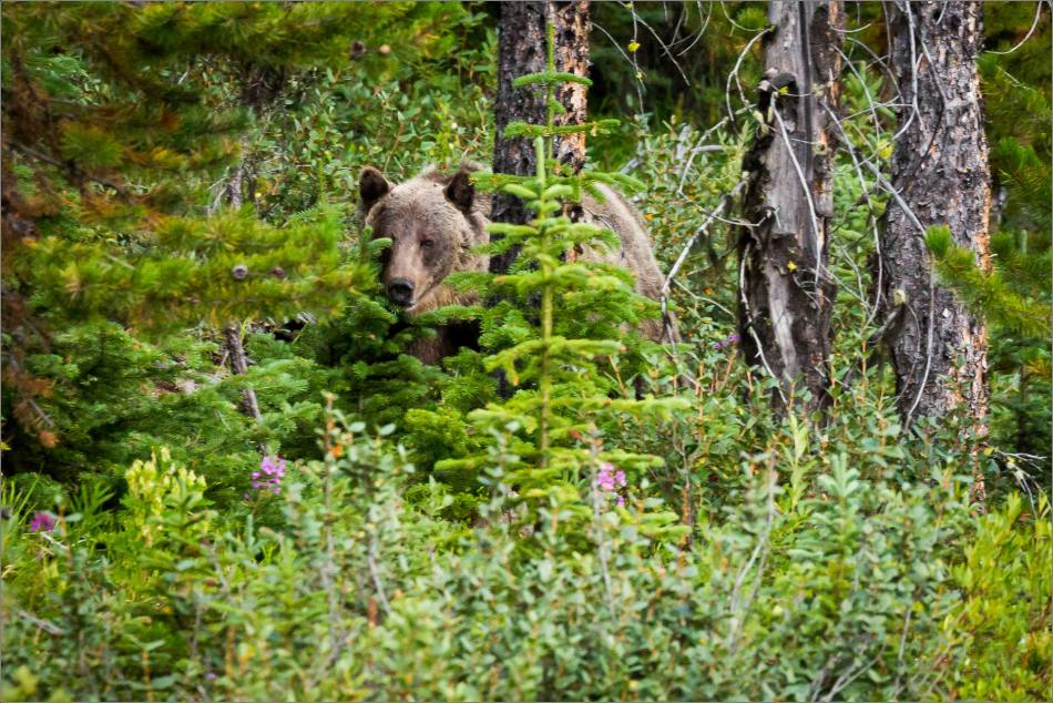 Last weekend I came across this grizzly bear late in the day along the Kananaskis Trail (Highway 40). He first came out of the forest on the high side of the hill and traveled through this patch of fireweed before slipping back into the woods.